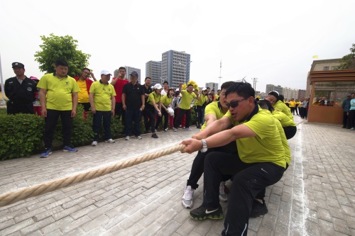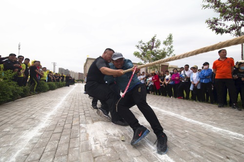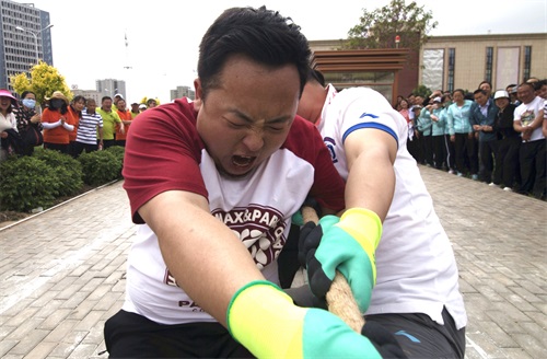 隨著一聲哨響,拔河比賽正式開始,比賽中參賽隊員雙手緊握長繩,大家都鉚足了勁兒、全力拼博,隨著長繩子上紅色錘線的左右移動,場外加油聲、吶喊聲、歡呼聲連成一片,場面蔚為壯觀。